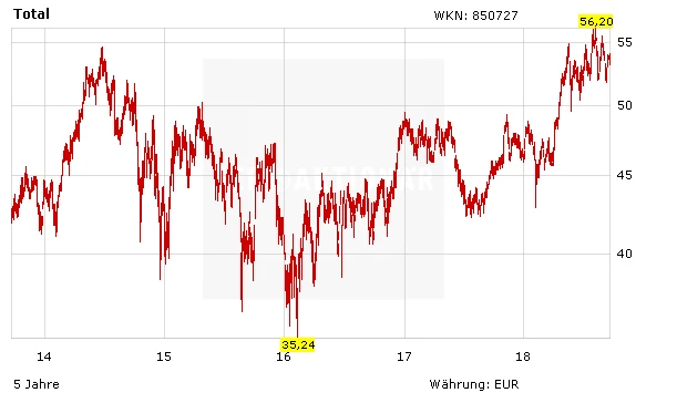 Am 25. September wird die Total-Aktie wieder ex-Dividende gehandelt. Wer in den Genuss der Quartalsausschüttung von nun 0,64 Euro (in den vier Quartalen zuvor waren es „nur“ 0,62 Euro gewesen) kommen will, müsste die Anteile also bis spätestens zum Handelsschluss am Dienstag gekauft haben. Die Ausschüttung erfolgt dann ab dem 12. Oktober. Auf das Gesamtjahr hochgerechnet errechnet sich eine Dividende von 2,56 Euro. Die Rendite würde demnach knapp 4,7 Prozent betragen. Was Anleger zu den Neuerungen bei der französische Quellensteuer wissen sollten, erfahren Sie hier.