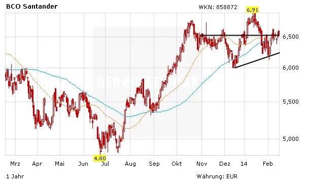 Auch charttechnisch gibt es grünes Licht bei der Banco-Santander-Aktie. Mit der nachhaltigen Überwindung der 6,50-Euro-Marke würde ein weiteres Kaufsignal generiert werden. Trader können hier mit engem Stopp aufspringen. Auch der Top-Tipp der Ausgabe 08/2014, Peugeot, bleibt ein Kauf. Das bereits 2013 als eine der "heißesten Aktien der Welt" vorgestellte Papier ist jedoch mindestens einen Tick spekulativer als Banco Santander.