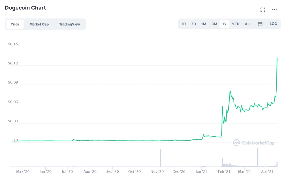 Der Kurs von Dogecoin schießt am Mittwochnachmittag auf 24-Stunden-Sicht um fast 75 Prozent nach oben. Zeitweise kostete ein DOGE mehr als 0,14 Dollar – ein neues Allzeithoch für den Krypto-Coin, der einst als Parodie auf den Bitcoin erfunden wurde. Auf Sicht von sieben Tagen hat sich der Dogecoin-Kurs inzwischen mehr als verdoppelt. Mit einer Market Cap von 18,2 Milliarden Dollar ist er zudem wieder in die Top 10 der größten Kryptowährungen eingezogen.