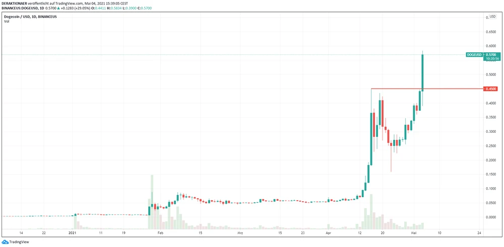 Der Preis für einen Dogecoin hat am heutigen Dienstag einen neuen Rekord aufgestellt und notiert aktuell bei 0,58 Dollar. Mit dem zweistelligen Kursanstieg heute pulverisierte der Coin den Widerstand bei 0,45 Dollar mühelos. Damit steigt der Kursgewinn auf über 7.500% in den letzten drei Monaten.