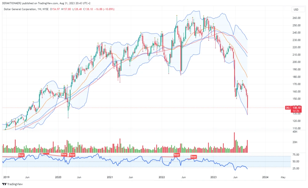 Die Dollar-General-Aktie notiert nun wieder auf dem Tiefstand im Corona-Crash (März 2020). Die neuen Zahlen schlagen Anleger massiv auf den Magen und weitere Kursverluste sind in den kommenden Tagen wahrscheinlich. Hier ist aktuell nichts zu holen und Anleger sollten an der Seitenlinie bleiben.