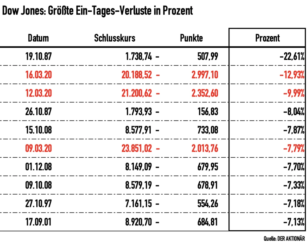 Der 19. Oktober 1987 ging als "Schwarzer Montag" in die Geschichte ein. Damals büßte der Dow Jones an einem einzigen Tag über ein Fünftel seines Wertes ein. Dennoch: Die aktuellen Verwerfungen an den Aktienmärkten überschatten in ihrer gesamten Dimension alles bisher dagewesene. Der Dow Jones hat an dieseme Montag 12,93 Prozent seines Wertes verloren. Es ist der zweithöchste Verlust der jüngeren Geschichte. Dabei hatte er erst am 12. März diesen bitteren Rekord aufgestellt.