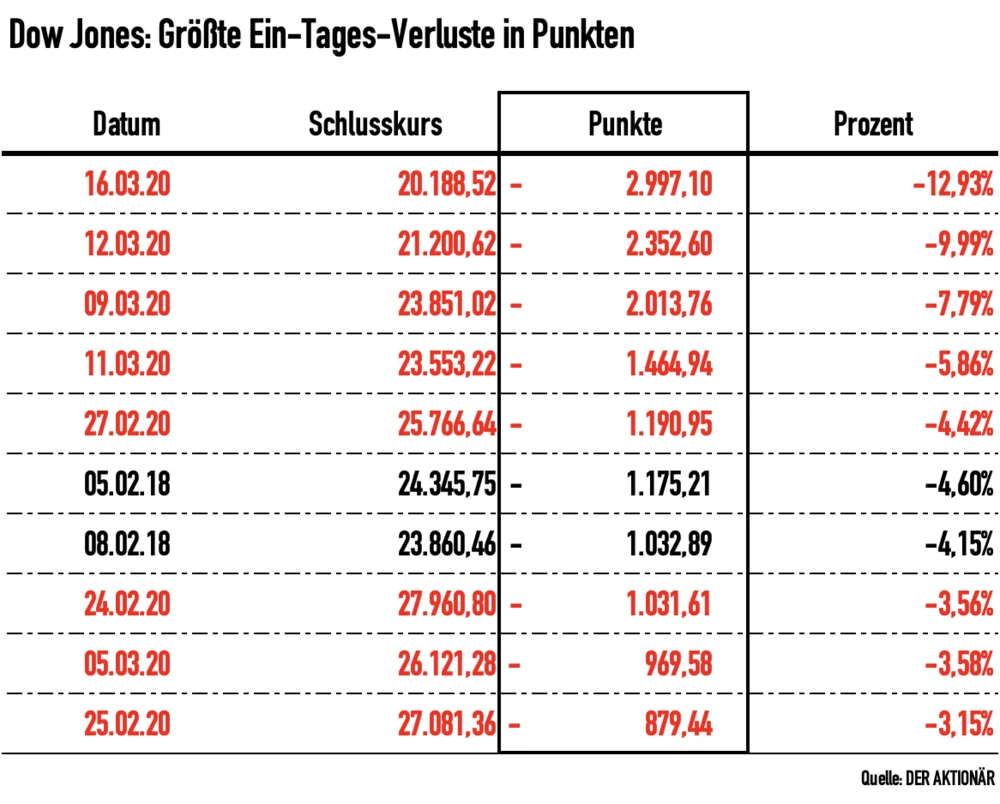 Betrachtet man die absolute Fallhöhe des meistbeachteten Aktienindex der Welt, wird das Bild noch weitaus dramatischer. Acht der zehn größten Punktverluste erlitt der Dow Jones seit Ende Februar und damit seit Ausbruch der Coronavirus-Pandemie in Europa. Am 22./23. Februar entschied die italienische Regierung Teile Norditaliens abzuriegeln. Seither stürzen die Aktienkurse in Europa und in den USA vermeintlich ins Bodenlose.