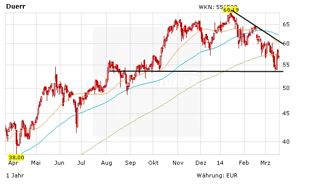 Der Anlagen- und Maschinenbauer Dürr hebt nach einem Gewinnsprung im vergangenen Jahr die Dividende an. Die Ausschüttung wird um 28 Prozent auf 1,45 Euro je Aktie steigen. '2013 war ein außerordentlich erfolgreiches Jahr', sagte Vorstandschef Ralf Dieter. Daran sollen auch die Aktionäre teilhaben. Positive Nachrichten kann die Dürr-Aktie gut gebrauchen. Nach dem Rekordstand von 68,19 Euro ist das Papier bis auf 54,00 Euro zurückgefallen. Eine Korrektur von rund 20 Prozent.