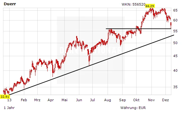 Die Dürr-Aktie führt am Freitag die Verliererliste im MDAX an. Bereits seit Tagen stehen die Papiere des Maschinenbauers unter Druck. Mit dem Rutsch unter die 60-Euro-Marke hat sich die Abwärtsbewegung zuletzt weiter an Fahrt aufgenommen.