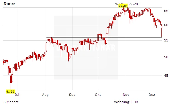 Nachdem die Dürr-Aktie am Freitag zum Handelsbeginn deutlich einknickte, hat sich das Papier des Maschinenbauers mittlerweile wieder deutlich erholt. Die Unterstützung bei 56,21 Euro hat somit gehalten. Nun dürften die Bullen wieder die Oberhand haben.