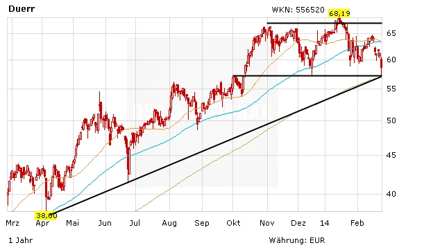 Im laufenden Jahr will Dürr mithilfe des Geschäfts in den Schwellenländern bei der Profitabilität weiter zulegen, Umsatz und Auftragseingang erwartet das Unternehmen jedoch bestenfalls etwas über Vorjahresniveau. Aus Sicht des Commerzbank-Experten Ingo-Martin Schachel haben die Konsenserwartungen an Umsatz und Auftragseingang nun ein Korrekturrisiko von rund drei Prozent. Die Margenziele könnten sich dagegen als 'so konservativ wie üblich' erweisen. Dennoch bleibt Schachel bei einem Kursziel für die Dürr-Aktie von 70,00 Euro.