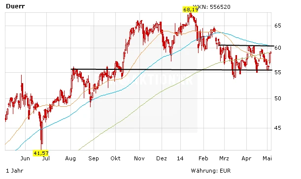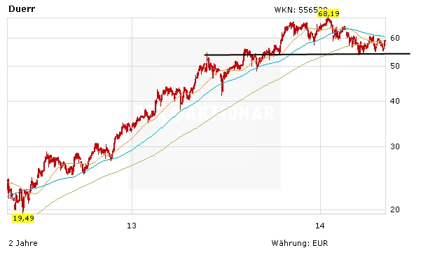 Sicherlich hat das Management von Dürr um Vorstand Ralf Dieter sowohl Aktionäre als auch Analysten zuletzt sehr verwöhnt. Durch den Rücksetzer von 68 auf 55 Euro hat sich das Chance-Risiko-Profil der Dürr-Aktie deutlich verbessert. Das KGV für das Geschäftsjahr beträgt jetzt moderate 14 für 2014, die Dividendenrendite 2,6 Prozent. Aktuell ist die Aktie eine Halteposition. Potenzial ergibt sich wieder bei einem Ausbruch über den horizontalen Widerstand bei rund 60,50 Euro. Die Aktie bleibt langfristig aussichtsreich.