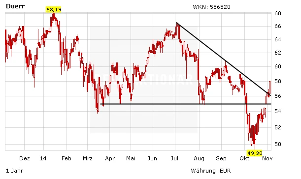 Beim Gewinn nach Steuern verbuchte Dürr im dritten Quartal ein Plus von 20 Prozent auf 42,4 Millionen Euro. Auf das Gesamtjahr gesehen rechnet der Anlagenbauer nun auch angesichts der niedrigeren Erlöse mit einem höheren EBIT-Anteil am Gesamtumsatz. Am Markt kam diese Nachricht gut an. Der Anlagenbauer habe eine überwältigende Marge berichtet und erneut einen starken Auftragseingang gezeigt, so DZ-Bank-Analyst Jasko Terzic. Seine Umsatzprognosen könnte er zwar etwas senken, die Zahlen sollten Dürr aber unterstützen. Den fairen Aktienwert berechnete Terzic bei 74 Euro, die Kaufempfehlung bestätigte der Experte.