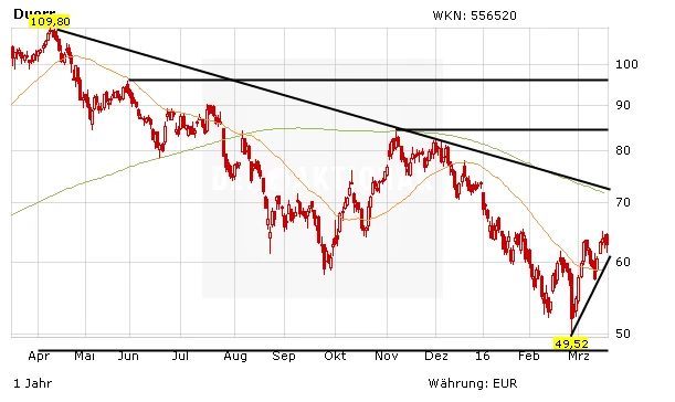 In der allgemeinen Marktschwäche gibt auch der Aktienkurs der Dürr AG nach. Die Anleger nehmen allerdings wohl auch die endgültigen, über den Erwartungen liegenden Zahlen für das vergangene Jahr beziehungsweise die Erinnerung an den vorsichtigen Ausblick auf das laufende Jahr übel. Denn der auf Lackier- und Holz bearbeitende Maschinen spezialisierte Konzern verliert überverhältnismäßig viel an der Börse.