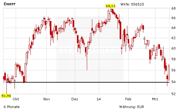 Durch den Rücksetzer von 68 auf 56 Euro hat sich das Chance-Risiko-Profil der Dürr-Aktie deutlich verbessert. Das KGV für das Geschäftsjahr beträgt jetzt moderate 14 für 2014, die Dividendenrendite 2,6 Prozent. Wer langfristig investieren will, sollte auf dem aktuellen Niveau eine Position aufbauen.