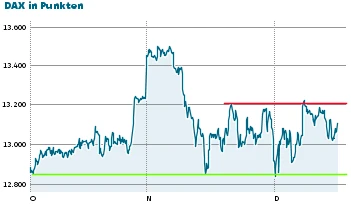 Der deutsche Leitindex bereitet sich wieder einmal auf einen Ausbruchsversuch vor. Nach starken Vorgaben von der Wall Street und der japanischen Börse notiert der XDAX vor Xetra-Eröffnung bei 13.200 Zählern und damit am oberen Rand der wochenlangen Seitwärtsrange. Sollte der DAX den Widerstand dieses Mal überwinden, könnte es noch eine kleine Weihnachtsrallye geben.