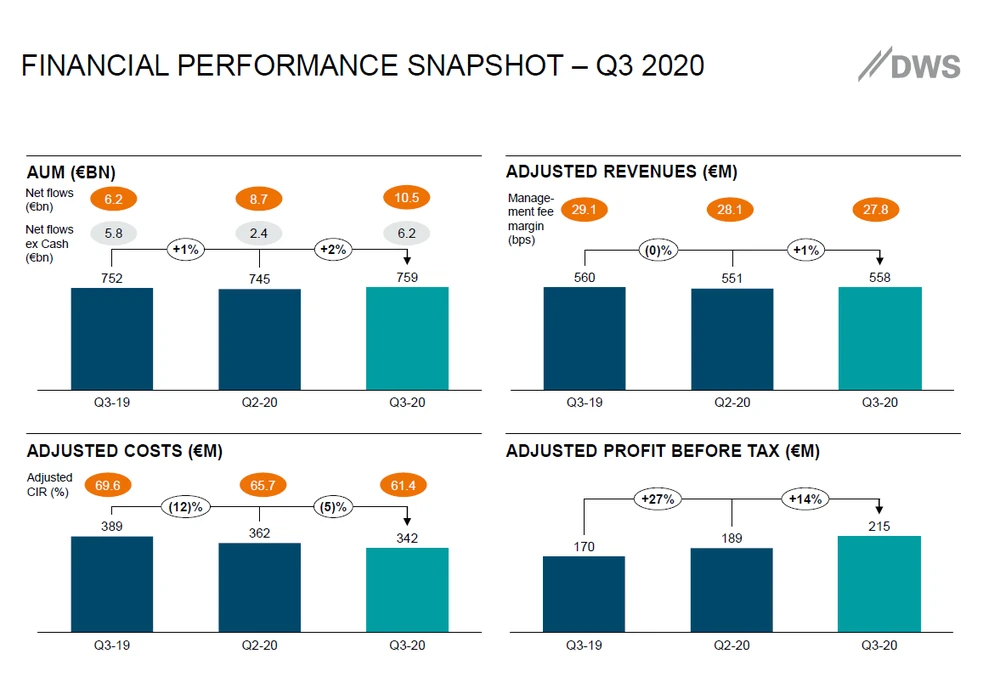 Das verwaltete Vermögen legte von 745 Milliarden Euro im zweiten Quartal auf nun 759 Milliarden weiter zu. Hintergrund sind eine bessere Marktentwicklung und gestiegene Nettomittelzuflüsse (+10,5 Milliarden in Q3). Analysten hatten lediglich mit 3,32 Milliarden gerechnet. Wöhrmann sagte: „Ein sehr gutes drittes Quartal mit hohen Nettomittelzuflüssen unterstreicht die Stärke unseres diversifizierten Geschäftsmodells auch in der Pandemie. Ab dem kommenden Jahr werden wir uns auf Wachstum und Transformation fokussieren, um auf die Megatrends zu reagieren, denen wir uns mit unseren Kunden gegenübersehen.“