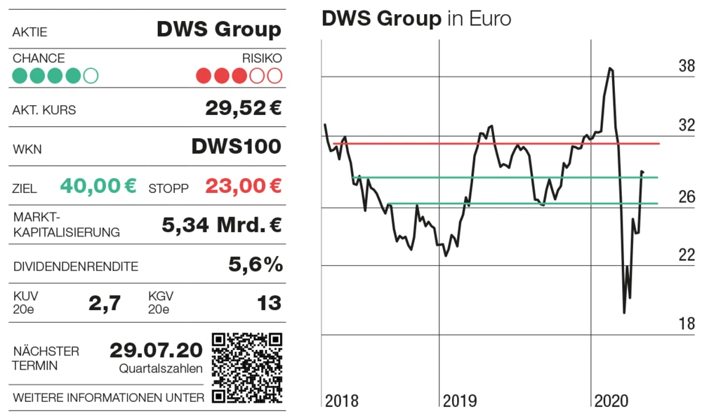 Positiv ist hingegen, dass der Vorstand am Kostenziel für nächstes Jahr festhält. Die Kosten-Ertrags-Quote soll unter 65 Prozent liegen. Frau Peel betont, dass es auch bei einer schlechten Marktentwicklung weiteres Einsparpotenzial gebe. Für Aktionäre wichtig ist in diesen Tagen die Dividende. Während andere streichen, will die DWS an der Ausschüttung von 1,67 Euro je Aktie für 2019 festhalten. Das sind derzeit mehr als fünf Prozent Rendite. Gut auch, dass die DWS breit aufgestellt ist und vermehrt Zukunftstrends wie Nachhaltigkeit (Stichwort ESG) mit Produkten bespielt. Normalisiert sich an den Märkten im zweiten Halbjahr die Situation, steht der Vermögensverwalter in den Startlöchern, um davon zu profitieren. Derweil sucht CEO Asoka Wöhrmann bereits nach neuen Kooperationen, vor allem in Asien. An der Konsolidierung in der Branche wolle die DWS aktiv teilnehmen, so Wöhrmann im Handelsblatt.