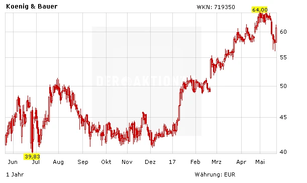 Ebenfalls stark nachgefragt sich die Aktien von Koenig & Bauer. Passend zur heutigen Hauptversammlung haben die Analysten von Hauck & Aufhäuser das Kursziel für den SDAX-Konzern von 72 auf 82 Euro angehoben. Die Investoren nehmen den Ball auf und steigen bei dem Druckmaschinenhersteller wieder ein. Auf dem Aktionärstreffen – das angesichts der operativen Entwicklung im vergangenen Jahr sehr harmonisch verlaufen sollte – dürfte eine Dividende in Höhe von 0,60 Euro je Aktie verabschiedet werden.