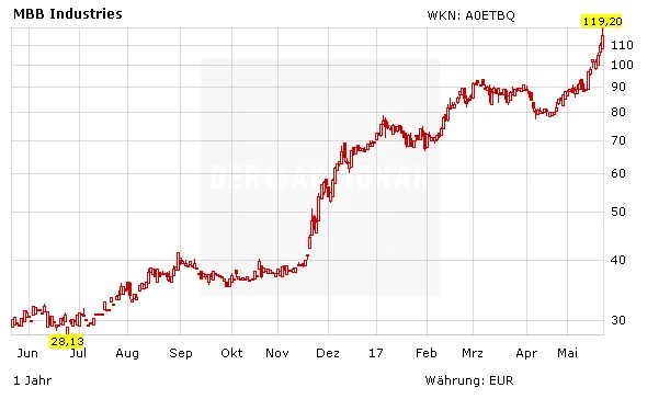 MBB ist eine familiengeführte Unternehmensgruppe, die etablierte Mittelstandunternehmen sucht, die durch ein wettbewerbsfähiges Angebot, eine solide Finanzausstattung und ein ambitioniertes Management über die Jahre an Wert gewinnen. Die Beteiligungsgesellschaft zählt schon seit einiger Zeit zu den AKTIONÄR-Favoriten unter den heimischen Nebenwerten. Hinter der Aktie liegt eine dynamische Aufwärtsbewegung. Mit dem nachhaltigen Sprung über die 93 Euro-Marke hat sich dieser Trend noch einmal beschleunigt. Seit dem Kaufsignal hat die Aktie über 25 Prozent an Wert zugelegt. Der Aufbau einer Trading-Position im Real-Depot vom AKTIONÄR vor gut einer Woche hat sich damit als voller Erfolg erwiesen.
