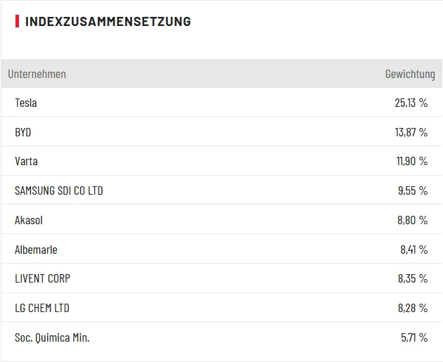 Der E-Mobilität Batterie-Index besteht aus den zukunftsträchtigen Batterieherstellern Varta, Samsung SDI und Akasol, Elektroauto-Hersteller Tesla und BYD den Lithium-Produzenten Albemarle, Livent und Soc.Quimica y Minera sowie dem weltweit größten Chemiekonzern LG Chem. mit Sitz in Hongkong. Ein Geschäftszweig des Unternehmens beschäftigt sich mit dem Thema Stromspeicherung speziell bei Photovoltaik-Anlagen.