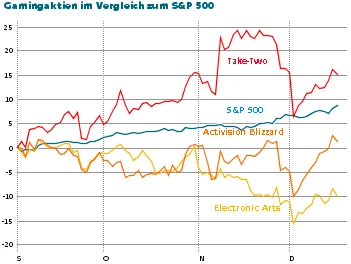 Die Verkäufe von Videospielen stiegen im November gegenüber dem Vorjahr um 30 Prozent auf 2,69 Milliarden Dollar. Die Aktienkurse der Gaming-Aktien konnten hier nicht mithalten. Im Vergleich zum S&P 500 konnten insbesondere die größeren Konzerne Activision Blizzard und Electronic Arts nicht mithalten. Die Aktie von Take-Two dagegen fällt erst Anfang November hinter die Performance des breiten S&P 500 zurück.