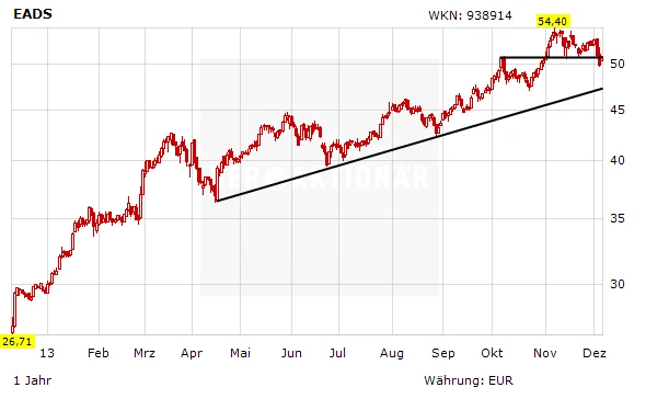 Die Aktie des Luft- und Raumfahrtkonzerns EADS hat in den vergangenen Wochen den Anstieg aus dem Sommer konsolidiert. Das Papier verharrt derzeit in einer Seitwärtsbewegung. Dennoch sieht die Deutsche Bank nach wie vor reichlich Kurspotenzial für die Aktie.