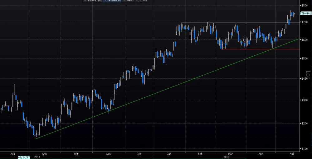 So verringerte Easyjet den Verlust in den für Fluggesellschaften traditionell schwierigen Wintermonaten von 192 auf 54 Millionen Pfund (61 Millionen Euro). Die Prognose für das bis Ende September laufende Geschäftsjahr hat Konzernchef Johan Lundgren bekräftigt. Demnach rechnet die Airline mit einem Vorsteuergewinn von 530 bis 580 Millionen Pfund. Im Zuge der überraschend starken Halbjahreszahlen ging es bei Bekanntgabe am Dienstag mit der Aktie weiter nach oben. Das Chartbild bleibt somit bullish.
