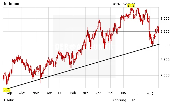 Charttechnisch ist die Situation bei Infineon trotz dieses Rücksetzers weiterhin gut. Seit die Bullen Anfang August an der 8-Euro-Marke das Steuer übernommen haben, klettert die Aktie nach oben. Derzeit ist die Hürde bei 8,50 Euro im Fokus der Anleger. Die weitere Richtung dürfte sicherlich durch die jüngsten Neuigkeiten vorgegeben werden.