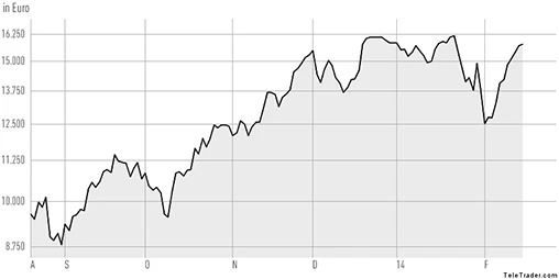 Dass sich das lohnt, zeigt ein Blick in das seit August 2013 bestehende Optionsschein-Depot (siehe Chart): 5.400 Euro hat verdient, wer 10.000 Euro investiert hat – 54 Prozent in 6 Monaten! Ob es für den Einstieg jetzt zu spät ist, wird oft gefragt. Ein klares Nein. Es gibt keinen schlechten Zeitpunkt. Denn: Jeder im Depot enthaltene Optionsschein ist solange ein Kauf, bis der Titel seinen Trend bricht. Erst dann wird er durch einen trendstärkeren Titel ersetzt.