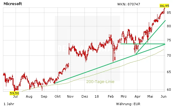 Bei Microsoft legen wir Wert auf Software-Entwicklung und mit den Zusammenschluss mit GitHub stärken wir unser Engagement im Bereich der freien, offenen und innovativen Software-Entwicklung.", sagte Microsoft-CEO Satya Nadella. Zudem bietet die Übernahme eine Möglichkeit, die GitHub-Entwickler auf eigene Plattformen zu lenken – insbesondere in der Cloud. Eine Chance, die auch der Aktie langfristig einen weiteren positiven Impuls geben dürfte. Es gilt: Gewinne laufen lassen!