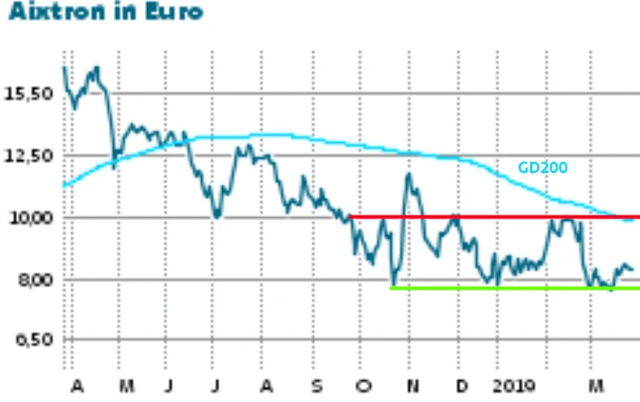 Der Auftragseingang liegt aktuell bei 303 Millionen Euro, soll im laufenden Jahr aber auf 220 bis 260 Millionen Euro fallen. Doch die Gesellschaft hat noch ein paar Trumpfkarten in der Hinterhand: Neben der Erschließung der Wachstumspotenziale im Bereich Leistungselektronik sorgen (im zweiten Halbjahr mögliche) Aufträge für neu entwickelte OLED-Anlagen für Fantasie. Damit bleibt die Hoffnung, dass die Investitionszurückhaltung der Kunden doch nur vorübergehender Natur ist.