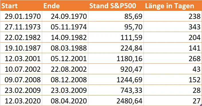 „Verliert ein Index in einem Bullenmarkt 20 Prozent an Wert, geht er in einen Bärenmarkt über. Gewinnt er in diesem wiederum 20 Prozent ausgehend von seinem Tief, tritt er in einen neuen Bullenmarkt ein“: Das ist die klassische (wenn auch recht willkürliche) Definition, um an der Börse zwischen aufwärts und abwärts gerichteten Phasen zu unterscheiden. Der letzte Bullenmarkt lief nach dieser simplen Einordnung vom 23. März 2009 bis zum 12. März 2020, ehe das Coronavirus ihm kürzlich den tödlichen Schlag versetze. Der sich anschließende Bärenmarkt war dann jedoch nicht jener völlige Zusammenbruch, den viele nach der elfjährigen Superhausse erwartet haben. Nach dem dynamischen 34-Prozent-Verlust schaffte er bereits zum 8. April wieder einen 20-Prozent-Anstieg seit seinem Tief. Hier die Liste der bisherigen Bärenmärkte des S&P500 seit 1970. In der gesamten Zeitperiode seit 1928 gab es insgesamt 26.