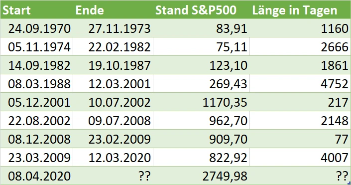 Interessant: Keiner der Bärenmärkte dauerte länger als ein Kalenderjahr. Doch nun sind wir ja bereits formal zurück unter den Bullen: Eine zentrale Frage ist dann natürlich, wie lange man nun mit dem neuen Bullenmarkt „rechnen“ kann. Lässt sich hierzu überhaupt eine sinnvolle Aussage treffen? Dazu ein Blick auf die bisherigen Bullenmärkte der letzten 50 Jahre: