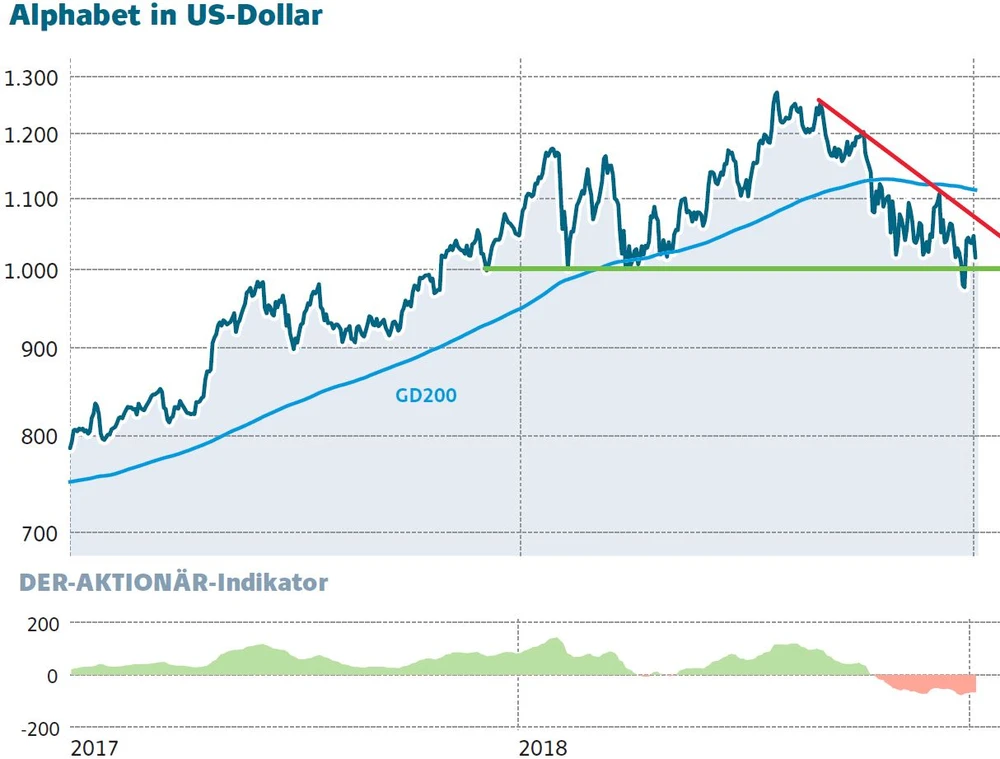 Hier besteht aussichtsreiches Langfrist-Potenzial für Alphabet und damit Kurspotenzial für die Aktie. Aktuell herrscht aber der Abwärtstrend vor. Im Bereich von 1.000 Dollar hat sich jedoch in der Vergangenheit eine wichtige Unterstützungsmarke herausgebildet. Anleger bleiben angesichts des Langfrist-Potenzials auch in schwachen Börsenzeiten investiert.