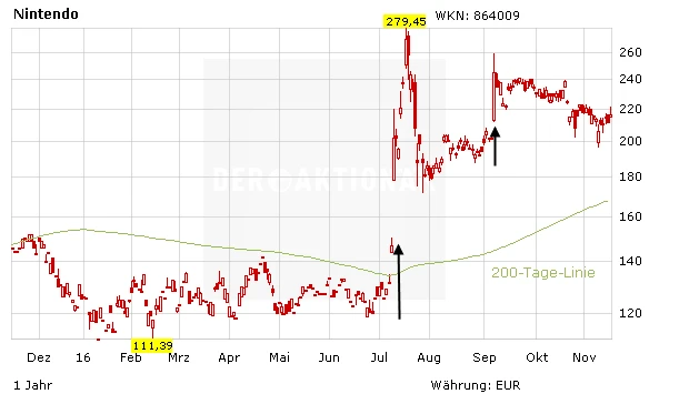 Anfang September wurde der Gaming-Hit bereits auf einer Apple-Keynote präsentiert. Infolgedessen schoss die Nintendo-Aktie um rund 18 Prozent nach oben – jedoch gaben die Papiere die Gewinne rasch wieder ab. Nachdem das finale Veröffentlichungsdatum von „Super Mario Run“ diese Woche bekannt gegeben wurde gewann der japanisch Titel zwischenzeitlich erneut über fünf Prozent – dies zeigt, dass nach dem Riesenerfolg von Pokémon Go hohe Erwartungen an das erste Mobile Game von Nintendo gestellt werden.