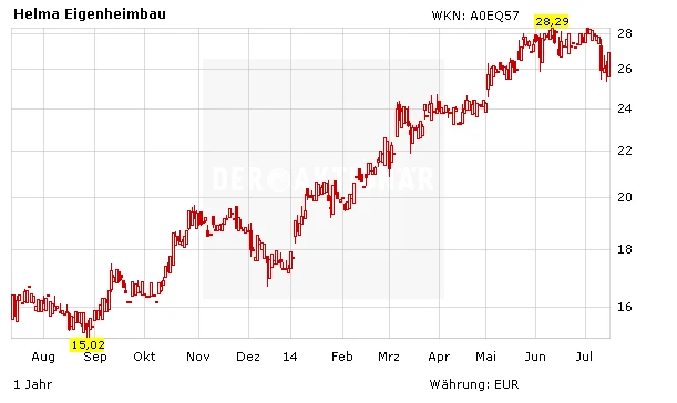 Helma Eigenheimbau ist weiter auf Wachstumskurs. Der Real-Depot-Wert hat die positive Vertriebsentwicklung der vergangenen Jahre im ersten Halbjahr 2014 erfolgreich fortgesetzt. Für die Aktie dürfte es ebenfalls weiter nach oben gehen. Kurse über 30 Euro sind nur eine Frage der Zeit.