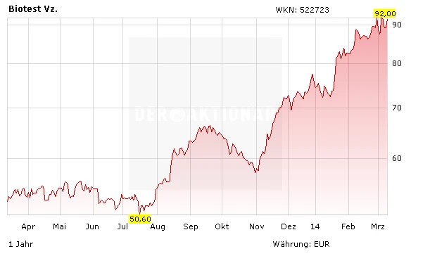 Biotest ist ein weltweit tätiger Spezialist für Immunologie und Hämatologie. Die Produkte retten Leben und geben chronisch Kranken neue Perspektiven. DER AKTIONÄR ist überzeugt: Anleger finden bei der Biotest-Vorzugsaktie auch nach der jüngsten Kursrallye ein für Biotech-Unternehmen sehr gutes Chance-Risiko-Profil. Zuletzt gab es eine Reihe von Kaufempfehlungen. Unter anderen hat die Privatbank Hauck & Aufhäuser das Kursziel für die Vorzugsaktien nach vorläufigen Zahlen von 97 auf 99 Euro angehoben und die Einstufung auf "Buy" belassen.