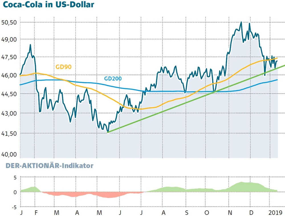Zusätzliche Wachstumsquellen kann Coca-Cola gut gebrauchen. Der Markt für kohlensäurehaltige Getränke gilt als gesättigt und auch Umstrukturierungen kennen Grenzen. Etwas abschreckend wirkt aktuell das nicht gerade billige 19er-KGV von 21. Positiv ist dagegen das aktuelle Sentiment für Basiskonsumgüter und die langjährig stabile Dividende. Investierte Anleger lassen die Gewinne entlang des gerade erst verteidigten Aufwärtstrends weiterlaufen.