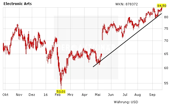 Angetrieben von den positiven Nachrichten zu „FIFA 17“ und den optimistischen Analysten, kletterte die Aktie von Electronic Arts am Freitag auf ein neues Allzeithoch von 84,50 Dollar. Damit baut sie ihren Aufwärtstrend weiter aus. Die drei neuen Spielehits dürften die Aktie auch in der zweiten Jahreshälfte kräftig unterstützen. Neueinsteiger schlagen bei Rücksetzern zu, spekulative Anleger können mit dem empfohlenen Mini-Long an der weiteren Kursentwicklung überproportional partizipieren.