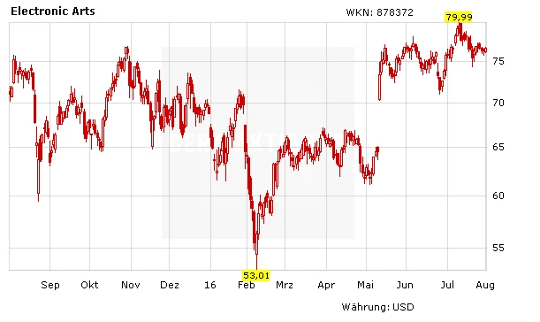 Für die heutigen Zahlen erwarten Analysten einen Verlust je Aktie von drei Cent gegenüber einem Gewinn je Anteilsschein von 15 Cent im Vorjahresquartal. Der Umsatz soll zudem von 693 Millionen Dollar vor einem Jahr auf jetzt 652 Millionen Dollar gesunken sein. Allerdings gehen Experten von einem besseren zweiten Halbjahr aus, da das Unternehmen dann mehrere neue Spiele auf den Markt bringt. Das aktuelle KGV von EA Games liegt bei 21 und soll nächstes Jahr auf 19 sinken. Mit Blockbustern wie FIFA und Battlefield erscheint das gerechtfertigt. Der langfristige Aufwärtstrend ist voll intakt und das Allzeithoch von 79,99 Dollar dürfte bei positiven Zahlen wieder in den Fokus rücken.