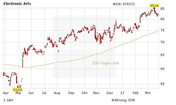 Das 17er KGV von 23 mag auf den ersten Blick hoch erscheinen, liegt jedoch im Peergroup-Vergleich in der Mitte (ATVI 24, UBI 23, TTWO 20, NTO 35). Auch das „hohe“ KUV von 5,5 siedelt sich im Mittelfeld der Branche an (ATVI 5,5, UBI 2,8, TTWO 2,8, NTO 7,8). DER AKTIONÄR setzt das Kursziel der EA-Aktie auf 97 Euro.