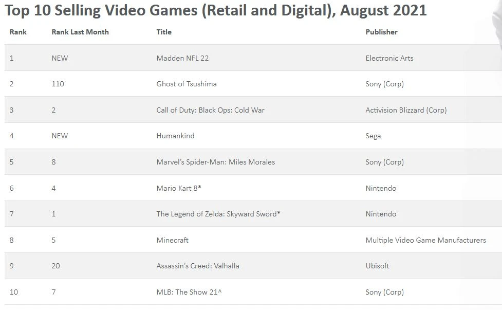 Abschließend bleibt auch der Gaming-Gesamtmarkt positiv: Laut den Marktforschern von der NPD Group ist der Markt im August um sieben Prozent auf 4,4 Milliarden Dollar angewachsen. Im gesamten Jahr 2021 gaben Spieler damit bereits 38 Milliarden Dollar für Games und Hardware aus – deutlich mehr als die 33,5 Milliarden in den ersten acht Monaten des Corona-Jahres 2020.