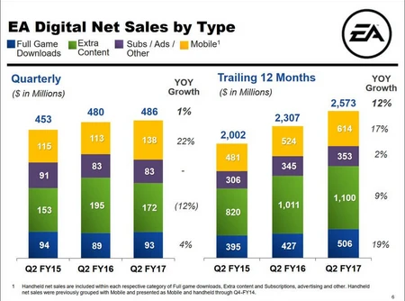 Verstärkt setzt der amerikanische Spiele-Entwickler auf den digitalen Verkauf der Games. Insgesamt 63 Prozent (entspricht 566 Millionen Dollar) erzielte EA per Download. Jedoch wächst dieses Segment derzeit lediglich vier Prozent. Am schnellsten in diesem Sektor wächst der Bereich der Mobile Games.