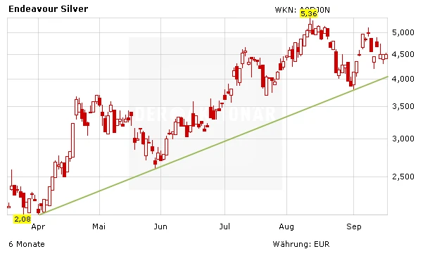 Zudem könnte der Silberproduzent die Eigenentdeckung Terronera in den kommenden Jahren in Produktion bringen, die mit erstaunlich hohen Silbergehalten glänzt. Mit diesen Projekten ist Endeavour Silver bestens für künftig steigende Kurse gerüstet. Am Freitag notiert die Aktie zwar über zwei Prozent im Minus. Allerdings ist das dem ebenfalls fallenden Silberpreis geschuldet, der der Unsicherheit am Markt im Vorfeld der FED-Sitzung zum Opfer fällt. Der Aufwärtstrend der Papiere ist weiterhin voll intakt. Anleger nutzen die Rücksetzer als günstige Kaufgelegenheit.