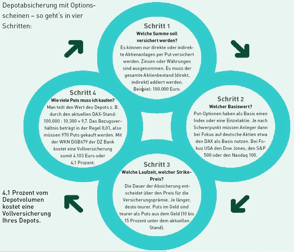 Profis nutzen daher zur Depotabsicherung Put-Optionsscheine. Wie das in der Praxis geht, erklärt folgendes Schaubild an einem konkreten Beispiel.