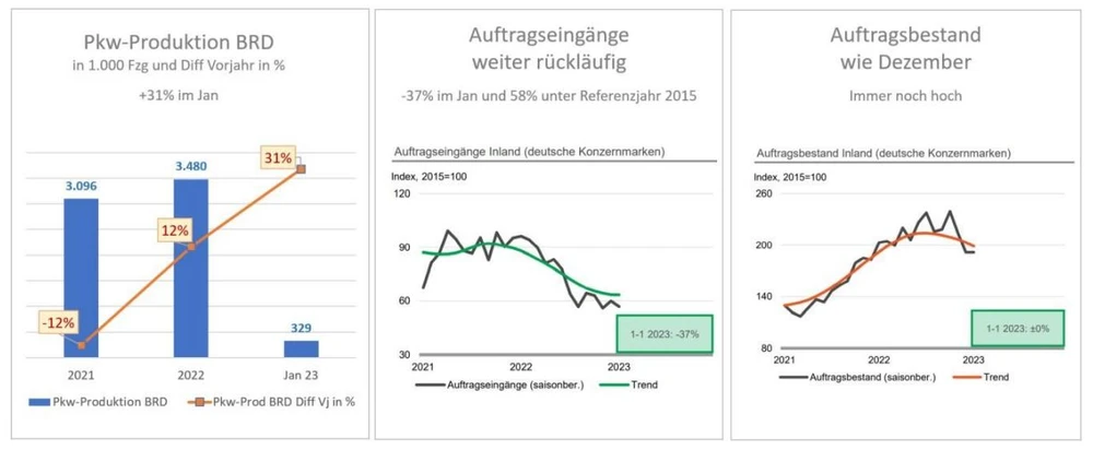 Autoexperte Prof. Dudenhöffer stellt nun fest: „Halbleiter-Hersteller berichten von nicht ausgenutzten Produktions-Kapazitäten, deutlich fallenden Preisen für Chips, die Chipkrise ist endgültig Vergangenheit. Das spiegelt sich an der Pkw-Produktion in Deutschland. So wurden im Januar mit 329.000 Neuwagen, 31 Prozent mehr produziert als im Vorjahresmonat.“