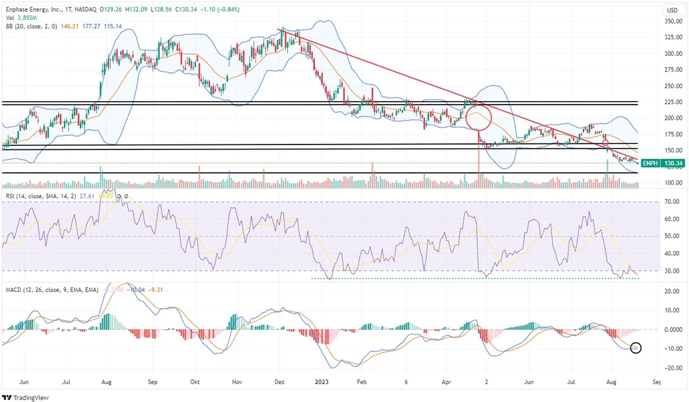 Das Grundproblem der Aktie bleibt trotz Verlangsamung des Abwärtstrends ungelöst. Enphase Energy ist technisch schwach und nach der Aufgabe des Unterstützungsbereiches zwischen 160 und 155 Dollar angeschlagen.
