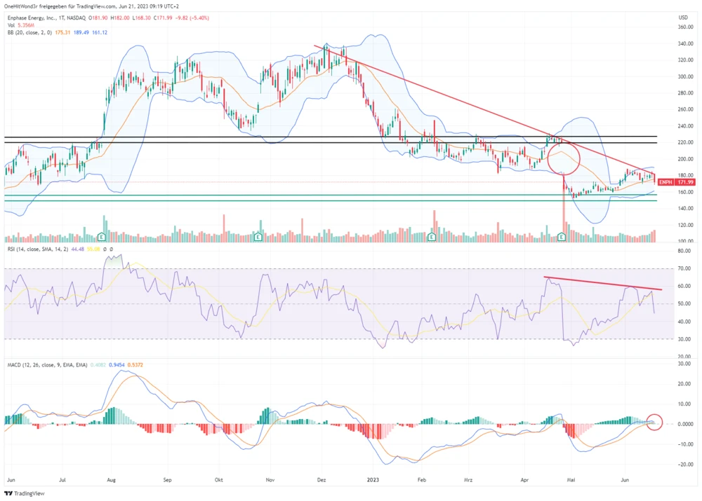 So der so kommen die Kursverluste insbesondere für SolarEdge und Enphase Energy zur Unzeit. Während SolarEdge auf den tiefsten Stand seit November letzten Jahres gefallen ist und mit einem weiteren Verlaufstief ein neues Verkaufssignal generiert hat, ist Enphase krachend an der Abwärtstrendlinie abgeprallt.