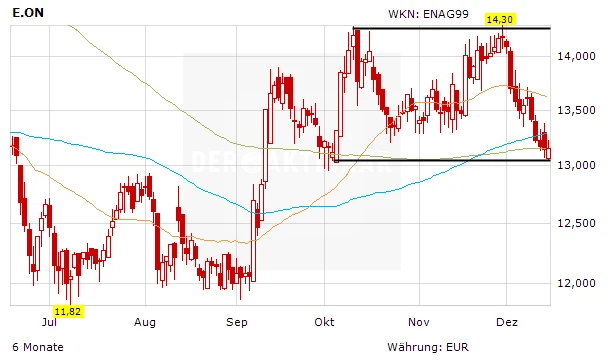 Während der DAX gestern kräftig zulegen konnte, ist die Aktie von E.on nahezu auf der Stelle getreten. Ausgehend von der soliden Unterstützung im Bereich um 13 Euro dürfte der Kurs des Energieriesen schon bald wieder aufdrehen.