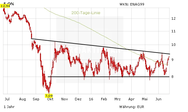 Am Donnerstag hat die Investmentbank Barclays neuen Schwung geliefert. Analyst Mark Lewis hat E.on von „Equal Weight“ auf „Overweight“ hochgestuft und das Kursziel von 8,80 auf 10,20 Euro angehoben. Die zuletzt deutlich gestiegenen Strompreise in Deutschland und die mittlerweile transparentere Bilanz von E.on dürften den Aktienkurs antreiben. Der Versorger sollte seinen Strategiewechsel nach dem Sommer abgeschlossen haben und vom positiveren Nachrichtenstrom in der zweiten Jahreshälfte profitieren.