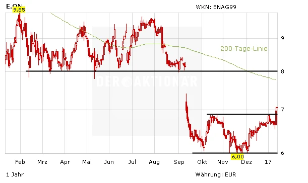Mehrfach ist die E.on-Aktie in der jüngeren Vergangenheit an wichtigen Widerständen abgeprallt. Dank der starken Performance am Mittwoch ist der Sprung über die Hürde bei 6,90 Euro nun aber vorerst gelungen. Im eher skeptischen Marktumfeld nach der Trump-Rede kann der Versorger am Donnerstag erneut zulegen.