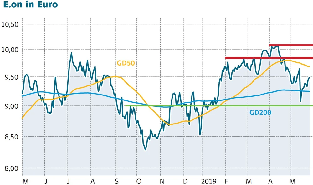 Schritt für Schritt ging es mit der E.on-Aktie in den vergangenen Tagen wieder nach oben. Seit dem Wiederaufflammen des Handelsstreits und dem Dividendenabschlag hat sich der Versorger von der 9,00-Euro-Marke gelöst. Nun warten in enger Taktung die nächsten Widerstände, der Befreiungsschlag aus der Seitwärtsbewegung könnte anstehen.