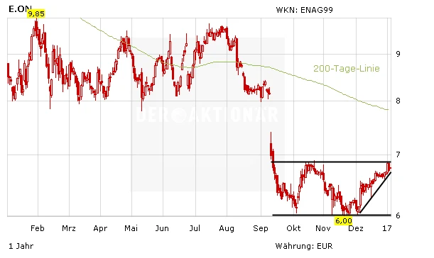 In den letzten Wochen des Jahrs 2016 hat die E.on-Aktie nach den deutlichen Verlusten zuvor eine Gegenbewegung gestartet. Zu Jahresbeginn steht der Versorger nun vor einer wichtigen Marke. Am Widerstand bei 6,90 Euro muss sich zeigen, ob der Aufwärtstrend weiter anhält. Für Konzernchef Johannes Teyssen wird es ein entscheidendes Jahr.